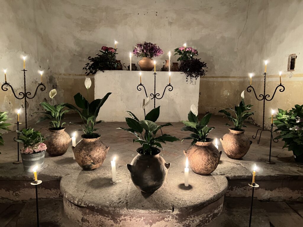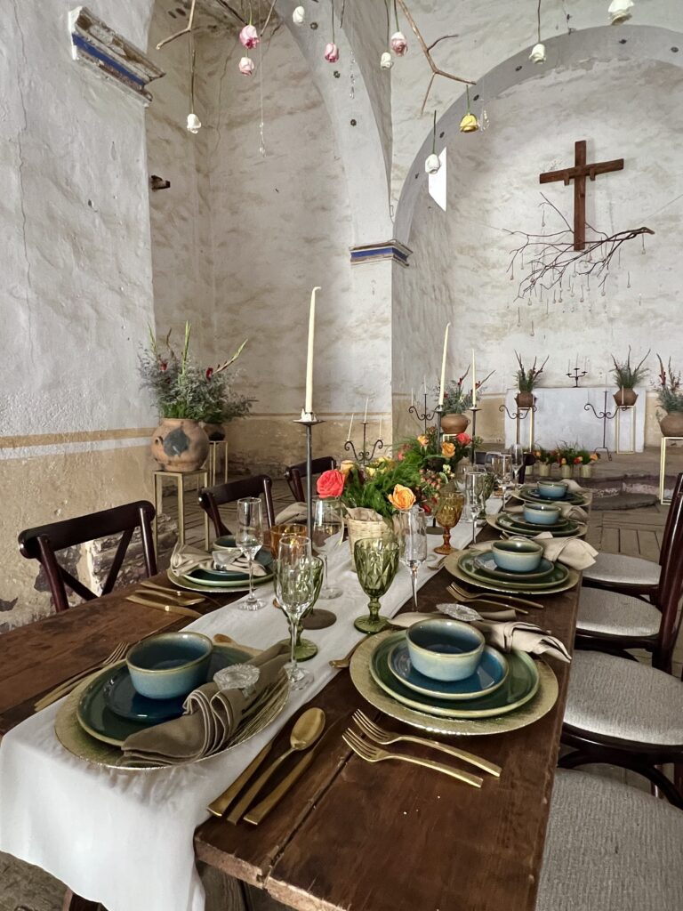 Vive una noche inolvidable con una cena en la capilla del siglo XVII. Desde la entrada, iluminada con antorchas, hasta el interior adornado con velas y flores de la estación, el ambiente crea una atmósfera íntima y acogedora.