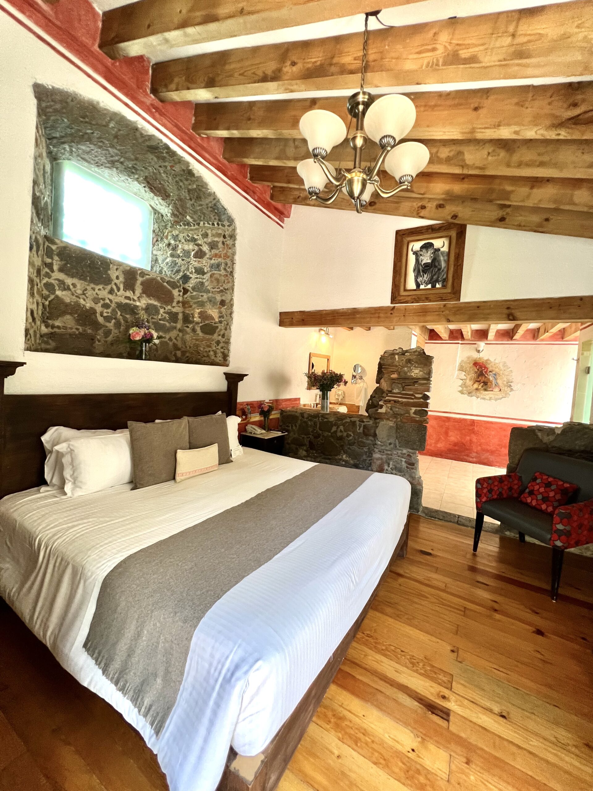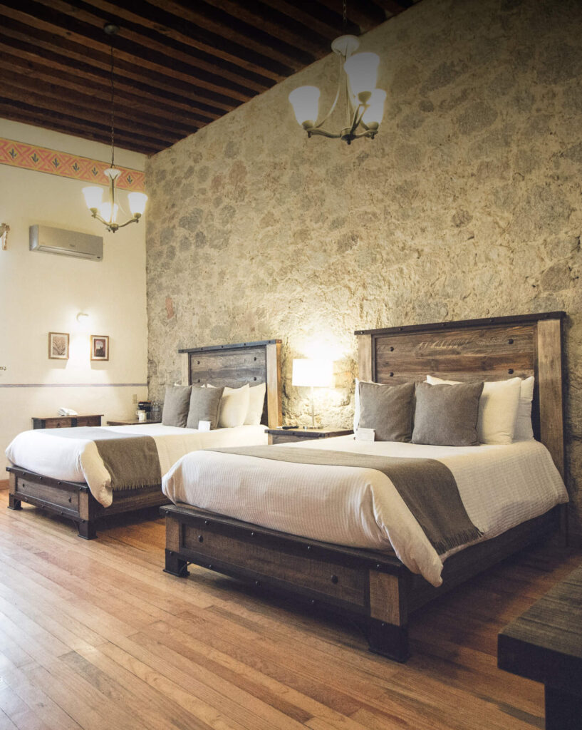 El hotel cuenta con 134 habitaciones de distintas categorías, integradas al entorno de la hacienda. En el casco principal se encuentran 30 habitaciones históricas, mientras que el campo de golf alberga suites sencillas y dobles, y el área tenística suma amplios espacios para el descanso. Entre ellas destaca la Master Suite “María Félix”, donde se hospedó la actriz durante el rodaje de La Escondida, sumando una capa de historia y cine al carácter del lugar.